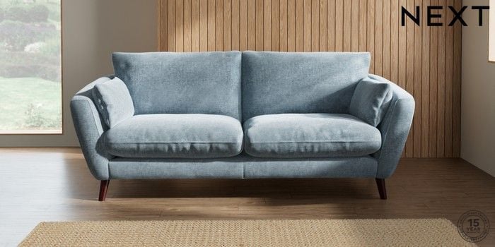 7.2.6 Buy Orlo Relaxed Sit 3 Seater Sofa Plush Chenille Light Blue Retro Tapered - Dark Brown from the Next UK online shop Click here to use our accessible website