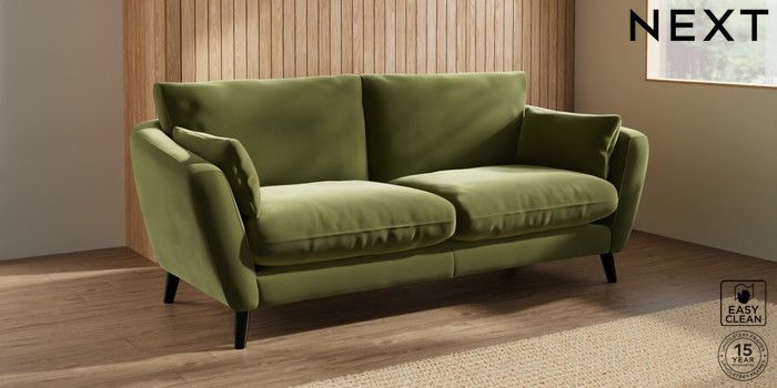 6.12.1 Buy Orlo Relaxed Sit 3 Seater Sofa Plush Velvet Easy Clean Mid Olive Green Retro Tapered - Dark from the Next UK online shop Click here to use our accessible website