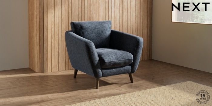 6.12.1 Buy Orlo Relaxed Sit Armchair Boucle Chenille Dark Slate Blue Retro Tapered - Mid from the Next UK online shop Click here to use our accessible website