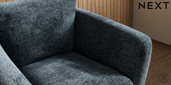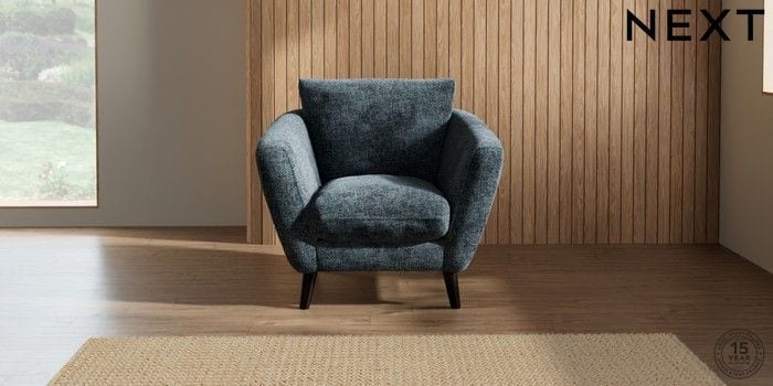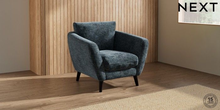 6.12.1 Buy Orlo Relaxed Sit Armchair Chunky Chenille Dark Navy Blue Retro Tapered - Dark from the Next UK online shop Click here to use our accessible website