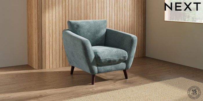 6.12.1 Buy Orlo Relaxed Sit Armchair Chunky Chenille Light Teal Green Retro Tapered - Dark Brown from the Next UK online shop Click here to use our accessible website