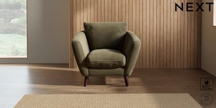 6.12.1 Buy Orlo Relaxed Sit Armchair Fine Chenille Easy Clean Dark Moss Green Retro Tapered - Dark Brown from the Next UK online shop Click here to use our accessible website