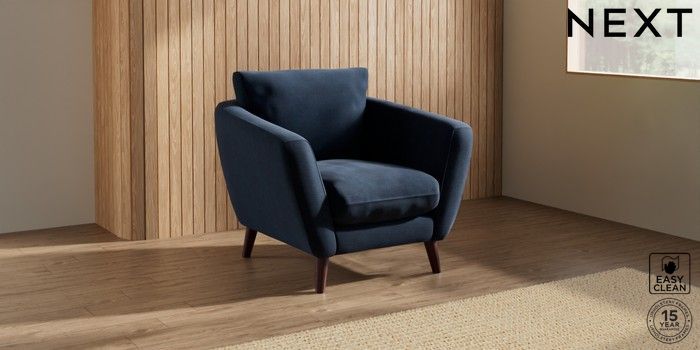 6.12.1 Buy Orlo Relaxed Sit Armchair Fine Chenille Easy Clean Dark Navy Blue Retro Tapered - Dark Brown from the Next UK online shop Click here to use our accessible website