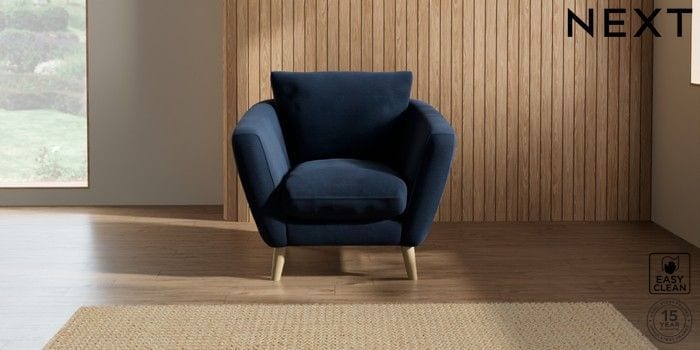 6.12.1 Buy Orlo Relaxed Sit Armchair Fine Chenille Easy Clean Dark Navy Blue Retro Tapered - Light from the Next UK online shop Click here to use our accessible website