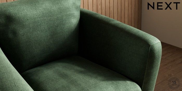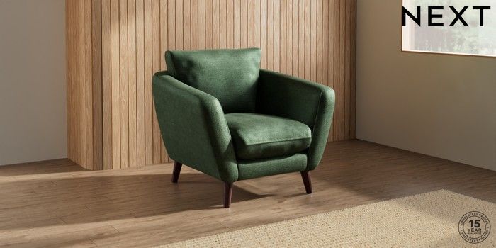 6.12.1 Buy Orlo Relaxed Sit Armchair Luxe Chenille Dark Green Retro Tapered - Dark Brown from the Next UK online shop Click here to use our accessible website