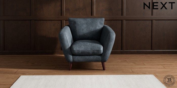 6.12.1 Buy Orlo Relaxed Sit Armchair Plush Chenille Slate Blue Retro Tapered - Dark Brown from the Next UK online shop Click here to use our accessible website