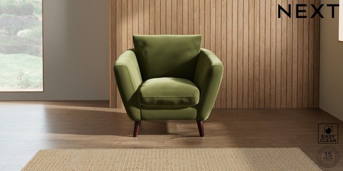 6.12.1 Buy Orlo Relaxed Sit Armchair Plush Velvet Easy Clean Mid Olive Green Retro Tapered - Dark Brown from the Next UK online shop Click here to use our accessible website