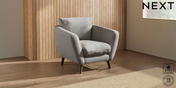 6.12.1 Buy Orlo Relaxed Sit Armchair Woven Chenille Easy Clean Light Grey Retro Tapered - Mid from the Next UK online shop Click here to use our accessible website