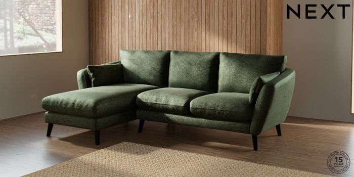 6.12.1 Buy Orlo Relaxed Sit Medium Sofa Chaise - Left Hand Boucle Chenille Dark Moss Green Retro Tapered - Dark from the Next UK online shop Click here to use our accessible website