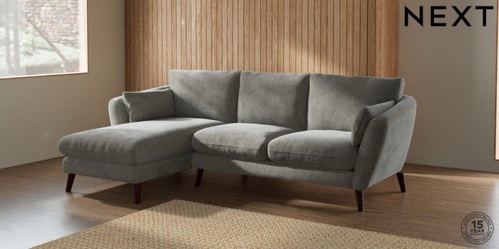 6.12.1 Buy Orlo Relaxed Sit Medium Sofa Chaise - Left Hand Chunky Chenille Light Grey Retro Tapered - Dark Brown from the Next UK online shop Click here to use our accessible website