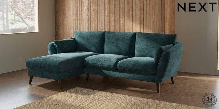6.12.1 Buy Orlo Relaxed Sit Medium Sofa Chaise - Left Hand Chunky Chenille Mid Teal Green Retro Tapered - Mid from the Next UK online shop Click here to use our accessible website