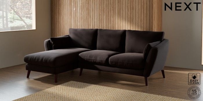 6.12.1 Buy Orlo Relaxed Sit Medium Sofa Chaise - Left Hand Fine Chenille Easy Clean Chocolate Brown Retro Tapered - Dark Brown from the Next UK online shop Click here to use our accessible website