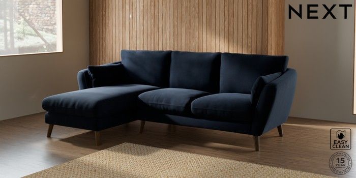 6.12.1 Buy Orlo Relaxed Sit Medium Sofa Chaise - Left Hand Fine Chenille Easy Clean Dark Navy Blue Retro Tapered - Mid from the Next UK online shop Click here to use our accessible website