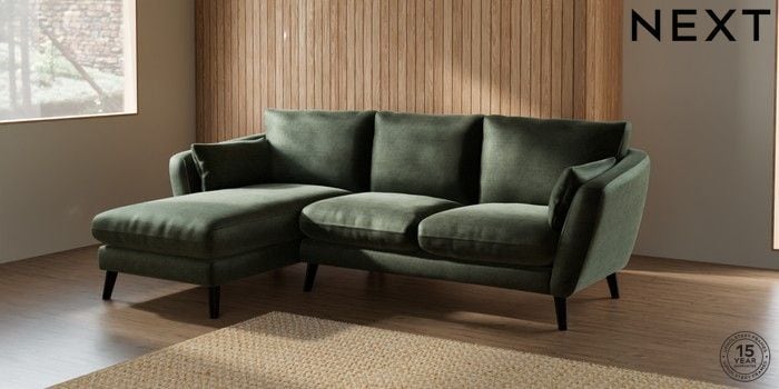 6.12.1 Buy Orlo Relaxed Sit Medium Sofa Chaise - Left Hand Luxe Chenille Mid Green Retro Tapered - Dark from the Next UK online shop Click here to use our accessible website