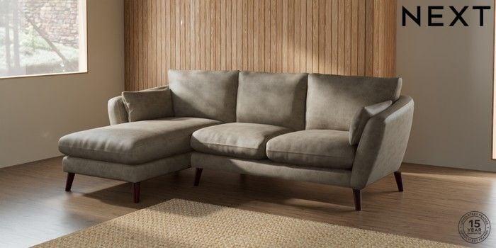 6.12.1 Buy Orlo Relaxed Sit Medium Sofa Chaise - Left Hand Monza Faux Leather Easy Clean Mink Brown Retro Tapered - Dark Brown from the Next UK online shop Click here to use our accessible website