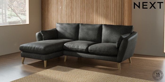 6.12.1 Buy Orlo Relaxed Sit Medium Sofa Chaise - Left Hand Plush Chenille Dark Grey Retro Tapered - Light from the Next UK online shop Click here to use our accessible website