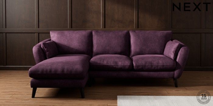 6.12.1 Buy Orlo Relaxed Sit Medium Sofa Chaise - Left Hand Plush Chenille Dark Plum Purple Retro Tapered - Dark from the Next UK online shop Click here to use our accessible website