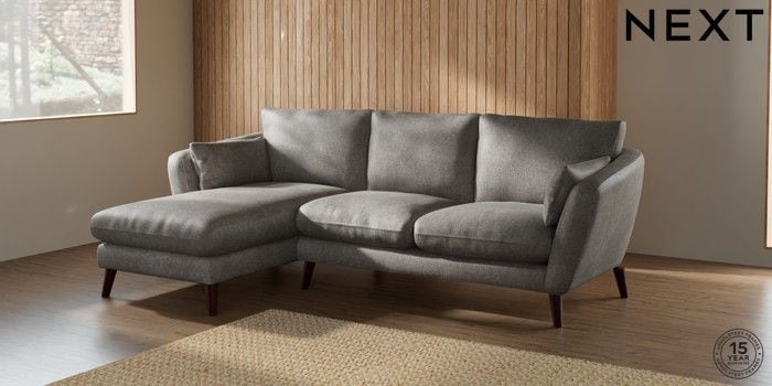 6.12.1 Buy Orlo Relaxed Sit Medium Sofa Chaise - Left Hand Plush Chenille Light Grey Retro Tapered - Dark Brown from the Next UK online shop Click here to use our accessible website
