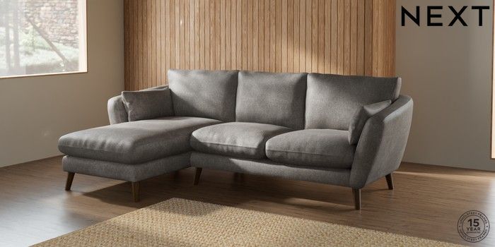 6.12.1 Buy Orlo Relaxed Sit Medium Sofa Chaise - Left Hand Plush Chenille Light Grey Retro Tapered - Mid from the Next UK online shop Click here to use our accessible website