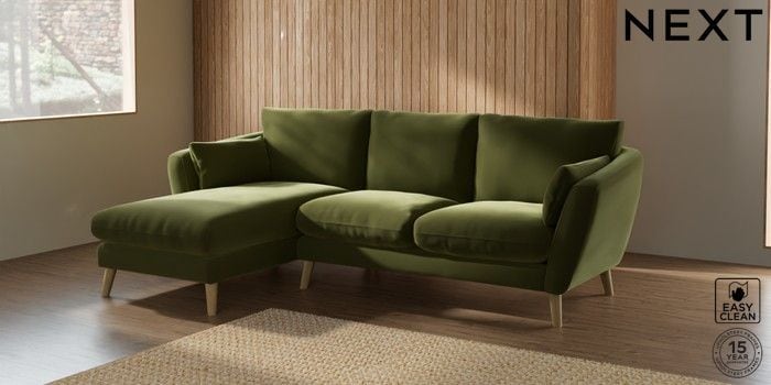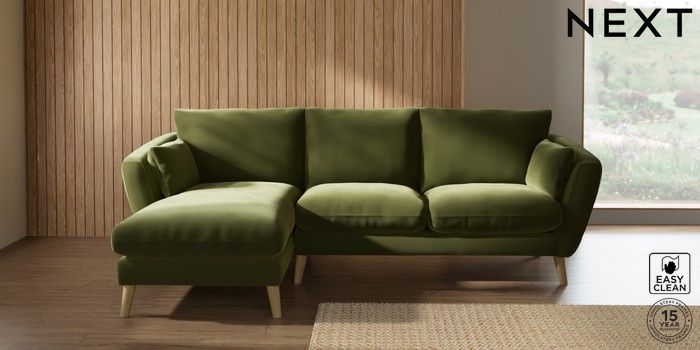 6.12.1 Buy Orlo Relaxed Sit Medium Sofa Chaise - Left Hand Plush Velvet Easy Clean Mid Olive Green Retro Tapered - Light from the Next UK online shop Click here to use our accessible website