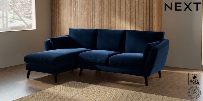 6.12.1 Buy Orlo Relaxed Sit Medium Sofa Chaise - Left Hand Plush Velvet Easy Clean Navy Blue Retro Tapered - Dark from the Next UK online shop Click here to use our accessible website