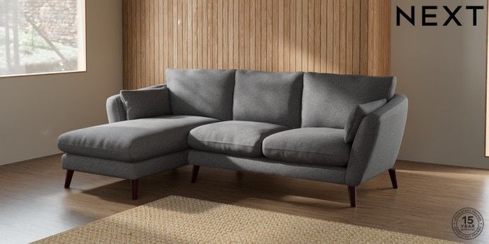 6.12.1 Buy Orlo Relaxed Sit Medium Sofa Chaise - Left Hand Studio Chenille Mid Grey Retro Tapered - Dark Brown from the Next UK online shop Click here to use our accessible website
