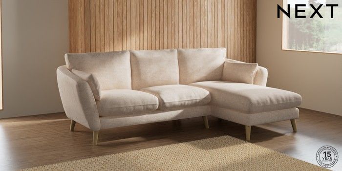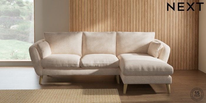 6.12.1 Buy Orlo Relaxed Sit Medium Sofa Chaise - Right Hand Boucle Chenille Oyster Retro Tapered - Light from the Next UK online shop Click here to use our accessible website