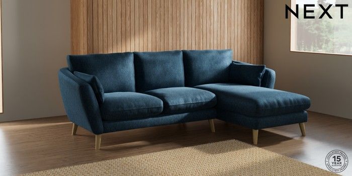 6.12.1 Buy Orlo Relaxed Sit Medium Sofa Chaise - Right Hand Cotswold Chenille Dark Blue Retro Tapered - Light from the Next UK online shop Click here to use our accessible website
