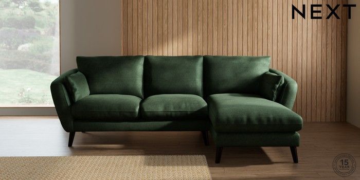 6.12.1 Buy Orlo Relaxed Sit Medium Sofa Chaise - Right Hand Luxe Chenille Dark Green Retro Tapered - Dark from the Next UK online shop Click here to use our accessible website