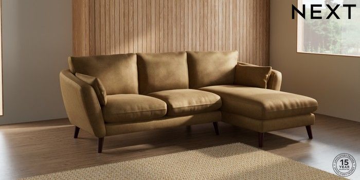 6.12.1 Buy Orlo Relaxed Sit Medium Sofa Chaise - Right Hand Luxe Chenille Honey Yellow Retro Tapered - Dark Brown from the Next UK online shop Click here to use our accessible website