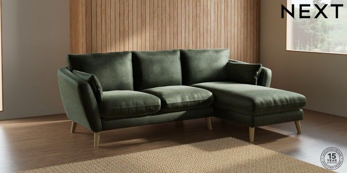 6.12.1 Buy Orlo Relaxed Sit Medium Sofa Chaise - Right Hand Luxe Chenille Mid Green Retro Tapered - Light from the Next UK online shop Click here to use our accessible website