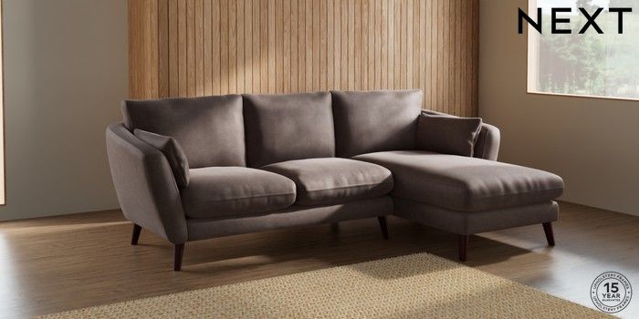 6.12.1 Buy Orlo Relaxed Sit Medium Sofa Chaise - Right Hand Luxe Chenille Mink Brown Retro Tapered - Dark Brown from the Next UK online shop Click here to use our accessible website