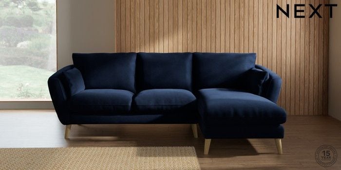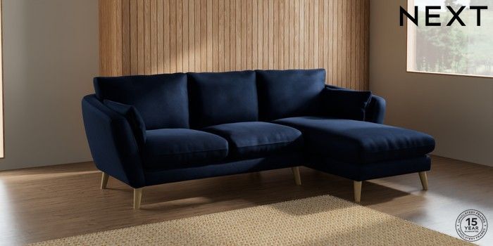 6.12.1 Buy Orlo Relaxed Sit Medium Sofa Chaise - Right Hand Luxe Chenille Navy Blue Retro Tapered - Light from the Next UK online shop Click here to use our accessible website
