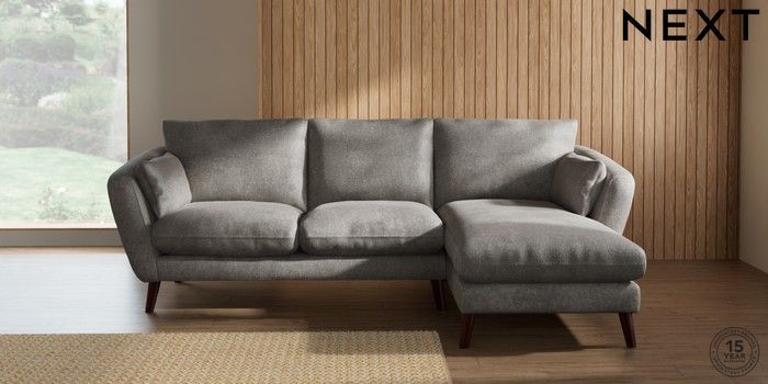 6.12.1 Buy Orlo Relaxed Sit Medium Sofa Chaise - Right Hand Plush Chenille Light Grey Retro Tapered - Dark Brown from the Next UK online shop Click here to use our accessible website