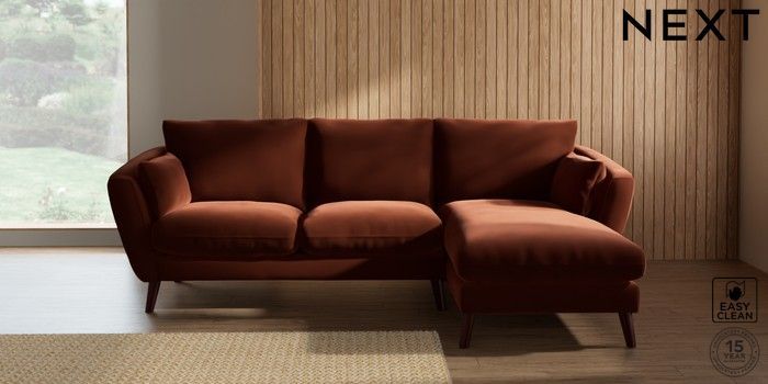 6.12.1 Buy Orlo Relaxed Sit Medium Sofa Chaise - Right Hand Plush Velvet Easy Clean Ginger Orange Retro Tapered - Dark Brown from the Next UK online shop Click here to use our accessible website