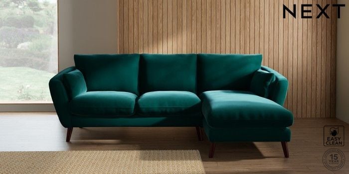 6.12.1 Buy Orlo Relaxed Sit Medium Sofa Chaise - Right Hand Plush Velvet Easy Clean Juniper Green Retro Tapered - Dark Brown from the Next UK online shop Click here to use our accessible website