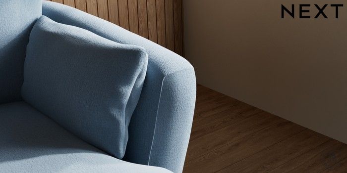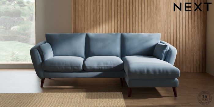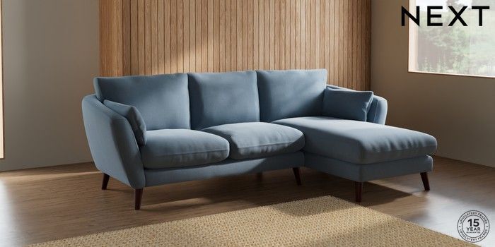 6.12.1 Buy Orlo Relaxed Sit Medium Sofa Chaise - Right Hand Relaxed Linen Look Mid Blue Retro Tapered - Dark Brown from the Next UK online shop Click here to use our accessible website