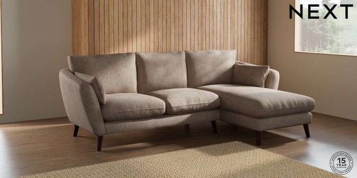 6.12.1 Buy Orlo Relaxed Sit Medium Sofa Chaise - Right Hand Tweedy Chenille Mid Natural Retro Tapered - Dark Brown from the Next UK online shop Click here to use our accessible website