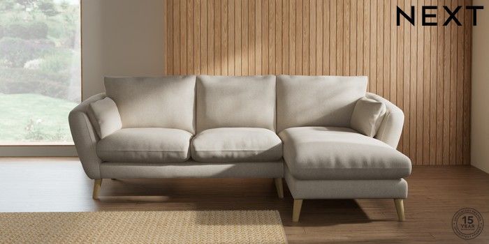 6.12.1 Buy Orlo Relaxed Sit Medium Sofa Chaise - Right Hand Tweedy Chenille Oyster Retro Tapered - Light from the Next UK online shop Click here to use our accessible website