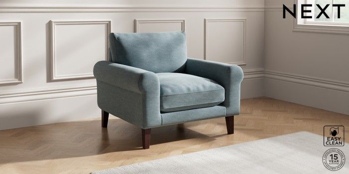 7.0.3 Buy Palermo Relaxed Sit Armchair Fine Chenille Easy Clean Mid Blue Tapered - Dark Brown from the Next UK online shop Click here to use our accessible website