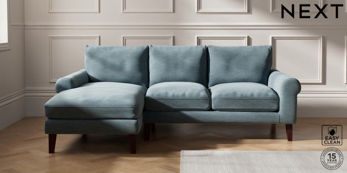 7.0.3 Buy Palermo Relaxed Sit Medium Sofa Chaise - Left Hand Fine Chenille Easy Clean Mid Blue Tapered - Dark Brown from the Next UK online shop Click here to use our accessible website