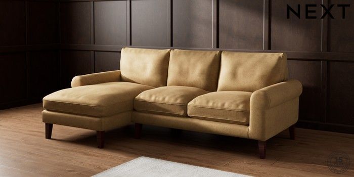 6.12.1 Buy Palermo Relaxed Sit Medium Sofa Chaise - Left Hand Luxe Chenille Honey Yellow Tapered - Dark Brown from the Next UK online shop Click here to use our accessible website