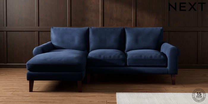 7.0.3 Buy Palermo Relaxed Sit Medium Sofa Chaise - Left Hand Luxe Chenille Navy Blue Tapered - Dark Brown from the Next UK online shop Click here to use our accessible website
