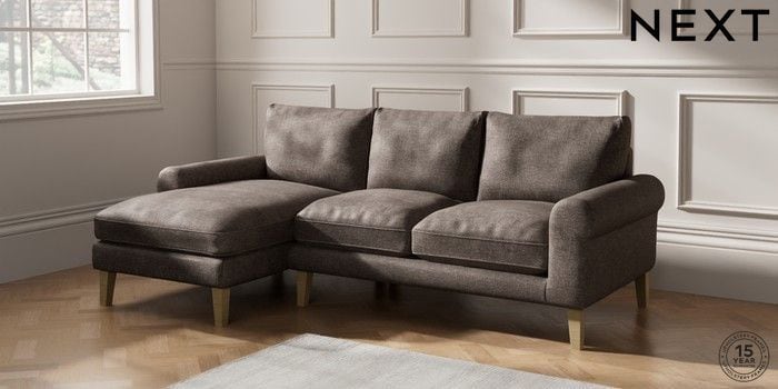 6.12.1 Buy Palermo Relaxed Sit Medium Sofa Chaise - Left Hand Plush Chenille Mink Brown Tapered - Light from the Next UK online shop Click here to use our accessible website