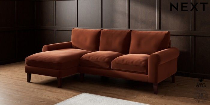6.12.1 Buy Palermo Relaxed Sit Medium Sofa Chaise - Left Hand Plush Velvet Easy Clean Ginger Orange Tapered - Dark Brown from the Next UK online shop Click here to use our accessible website