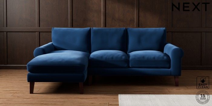 7.0.3 Buy Palermo Relaxed Sit Medium Sofa Chaise - Left Hand Plush Velvet Easy Clean Navy Blue Tapered - Dark Brown from the Next UK online shop Click here to use our accessible website