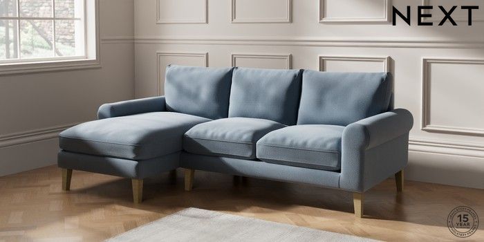 6.12.1 Buy Palermo Relaxed Sit Medium Sofa Chaise - Left Hand Relaxed Linen Look Mid Blue Tapered - Light from the Next UK online shop Click here to use our accessible website