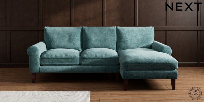 7.0.3 Buy Palermo Relaxed Sit Medium Sofa Chaise - Right Hand Chunky Chenille Mid Teal Green Tapered - Dark Brown from the Next UK online shop Click here to use our accessible website