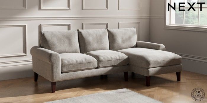6.12.1 Buy Palermo Relaxed Sit Medium Sofa Chaise - Right Hand Chunky Weave Dove Grey Tapered - Dark Brown from the Next UK online shop Click here to use our accessible website