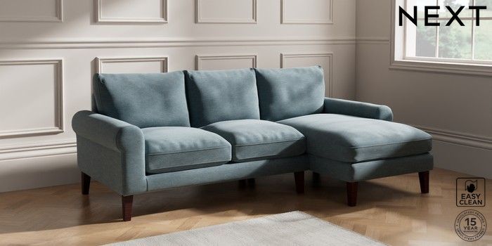 6.12.1 Buy Palermo Relaxed Sit Medium Sofa Chaise - Right Hand Fine Chenille Easy Clean Mid Blue Tapered - Dark Brown from the Next UK online shop Click here to use our accessible website